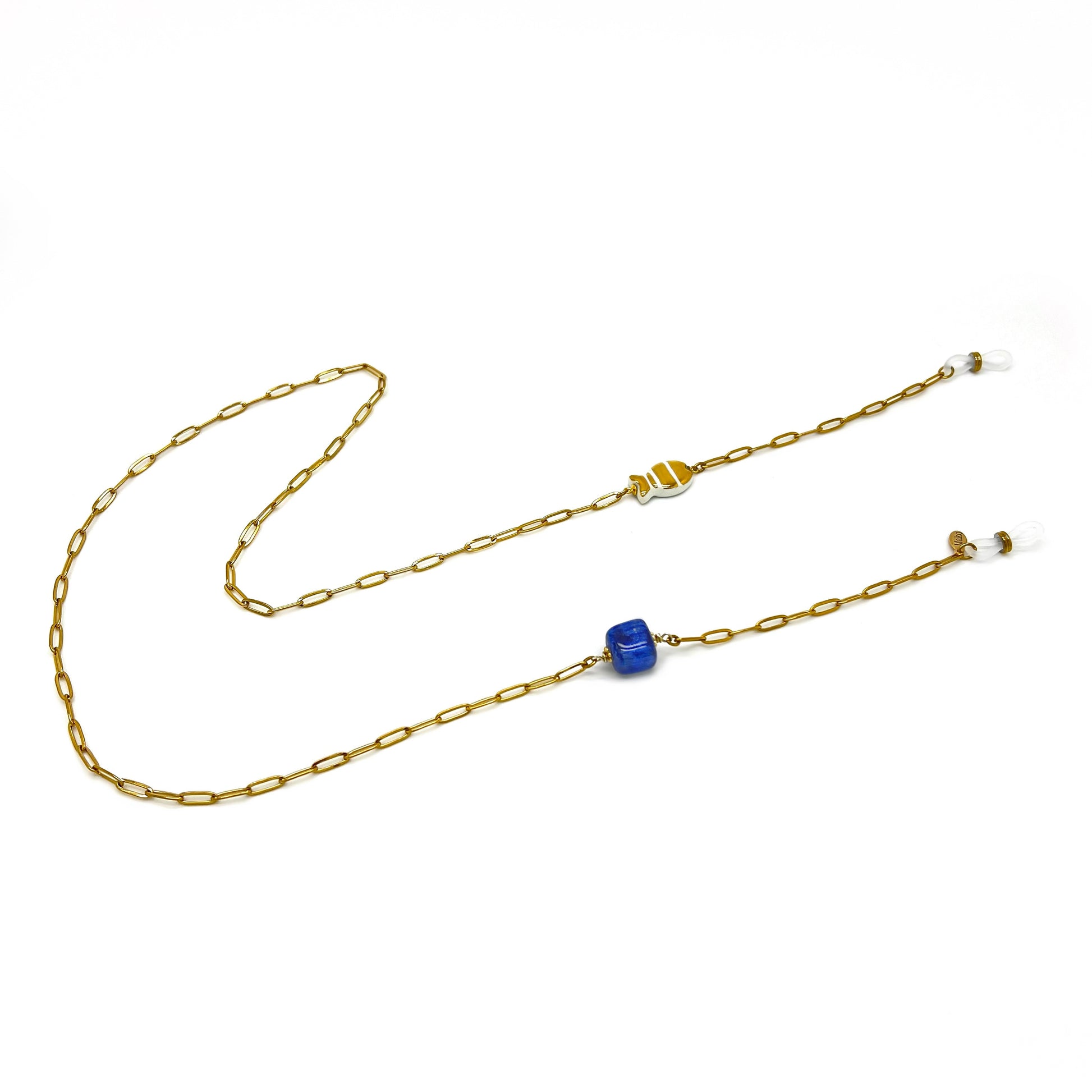 Chains for glasses with Majolica and blue cube in Vietri ceramic, made and painted entirely by hand according to the local tradition. The majolica features the classic pattern of the tile in dark blue and white with gold details.