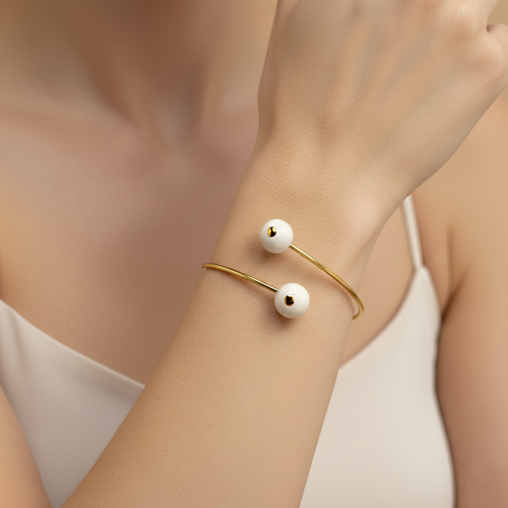 Bracciale bangle con due mezze sfere in ceramica vietrese in bianco e oro, interamente realizzate e dipinte a mano tramite le antiche tecniche dell'artigianato locale.